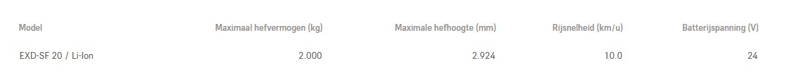 De EXD-SF-20 is de ideale oplossing voor horizontaal transport over langere afstanden. Dankzij de dubbeldeks functionaliteit verplaatst hij twee pallets van 1.000 kg tegelijk of één van 2.000 kg. Met luchtgeveerd staplatform, verstelbare zijarmen en Dynamic Drive Control biedt hij snelheid, stabiliteit en rijcomfort in elke situatie.