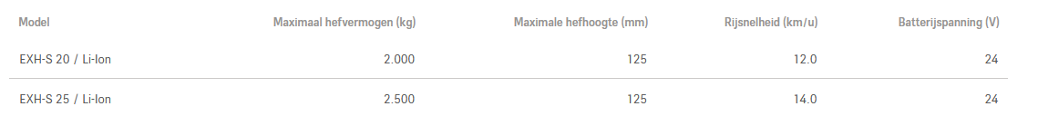 De EXH-S pallettruck combineert kracht, veiligheid en comfort in één. Met 2.500 kg hefvermogen, 14 km/u topsnelheid en extra lange vorken verplaatst hij moeiteloos twee pallets tegelijk. Het verstelbare Easy Drive-stuurwiel en luchtgeveerde platform bieden ergonomie en controle, terwijl de Li-ion batterij flexibiliteit en continue inzetbaarheid garandeert.