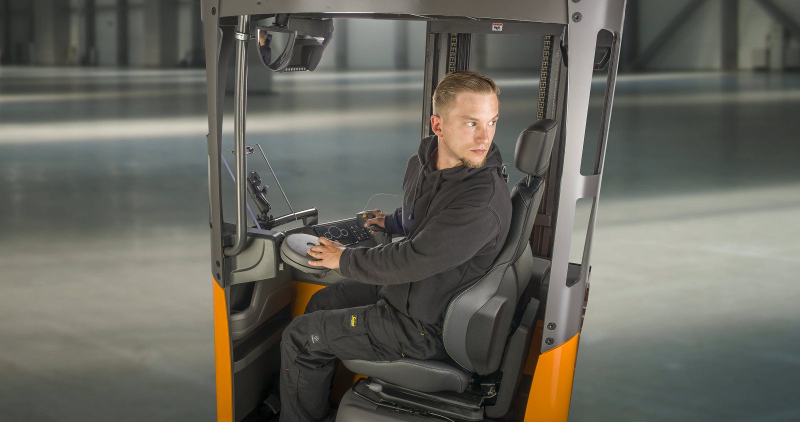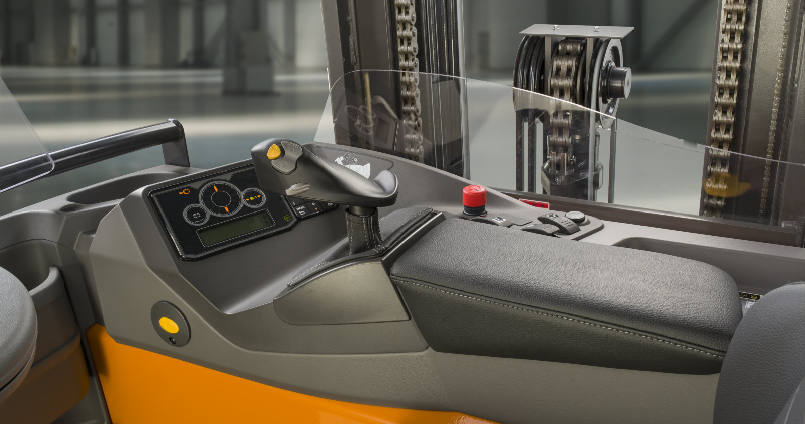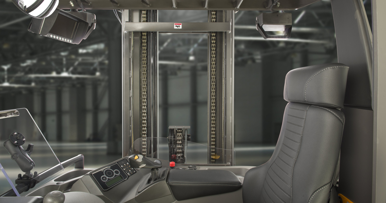 De gebruikerscabine is ergonomisch verstelbaar op stoel, armleuningen, stuur en voetplaat, wat zorgt voor een optimale werkhouding. Alle functies zijn eenvoudig bedienbaar via joystick of fingertipcontrole zonder handwisselingen. De comfortabele kantelstoel met pneumatische lendensteun maakt het mogelijk gemakkelijk boven en langs de lading te kijken.