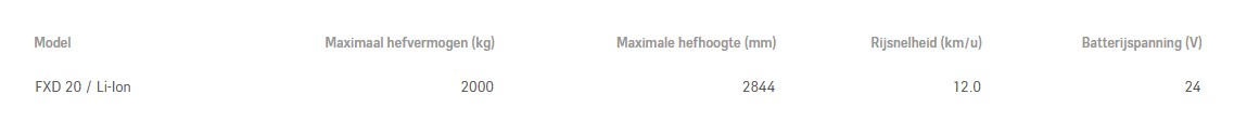 De FXD 20 dubbeldeks stapelaar vervoert moeiteloos twee pallets tegelijk tot 2.000 kg en rijdt tot 12 km/u. Met een hefvermogen tot 1.200 kg en masthoogte boven 2,3 m is hij veelzijdig en krachtig. Li-ion accu en zijdelingse accuwissel maken 24/7 inzet mogelijk. Ergonomische joystick en veiligheidsfuncties zorgen voor comfort en bescherming