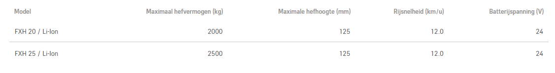 De FXH 20-25 verwerkt efficiënt goederen met een snelheid tot 12 km/u en een hefvermogen van 2.500 kg. De hoge accucapaciteit tot 625 Ah en robuust chassis met optioneel tegengewicht zorgen voor betrouwbaarheid en continu gebruik.