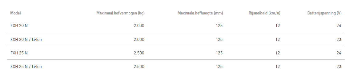 De FXH 20/25 N combineert kracht, snelheid en compactheid in één model. Met een hefvermogen tot 2.500 kg, een snelheid van 12 km/u en een handlingcapaciteit tot 162 ton per uur levert deze truck topresultaten in industriële toepassingen. De Li-ion accu garandeert maximale beschikbaarheid en energie-efficiëntie.