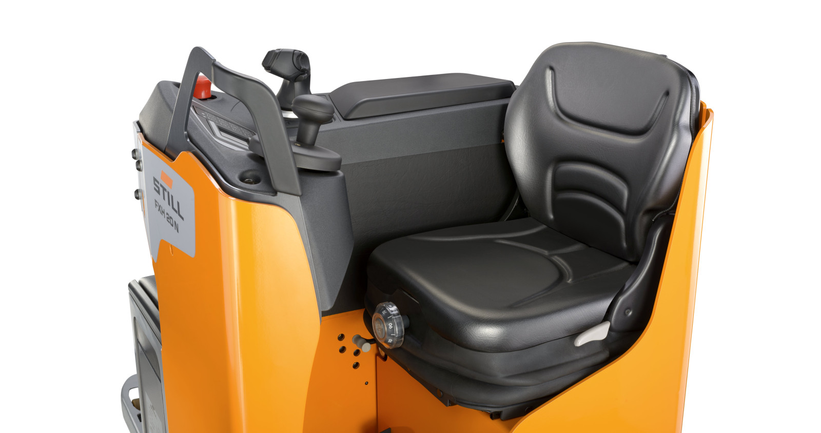 De verende stoel, in hoogte verstelbare voetplaat en een royaal werkstation bieden optimaal comfort, zelfs bij lange ritten. De joystick of het ergonomische stuurwiel maakt nauwkeurige bediening mogelijk zonder van hand te wisselen.