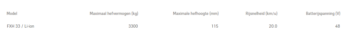 De FXH 33 is een echte krachtpatser onder de laagheffende pallettrucks. Met een hefvermogen tot 3.300 kg en een snelheid van 20 km/u transporteert hij moeiteloos drie pallets tegelijk. Dankzij het geveerde stuurstoeltje, hoge zitpositie en slim kleurendisplay biedt hij maximale prestaties én ergonomisch comfort, ook bij zware inzet.