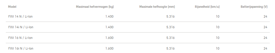 De FXV N tilt tot 5.316 mm hoog en rijdt 10 km/u. De krachtige 3 kW‑motor en batterij tot 620 Ah garanderen langdurige inzet. Dankzij lithium‑iontechnologie is tussentijds opladen eenvoudig. ECO‑, BOOST‑ en Blue‑Q‑standen zorgen voor de juiste balans tussen prestatie en efficiëntie.
