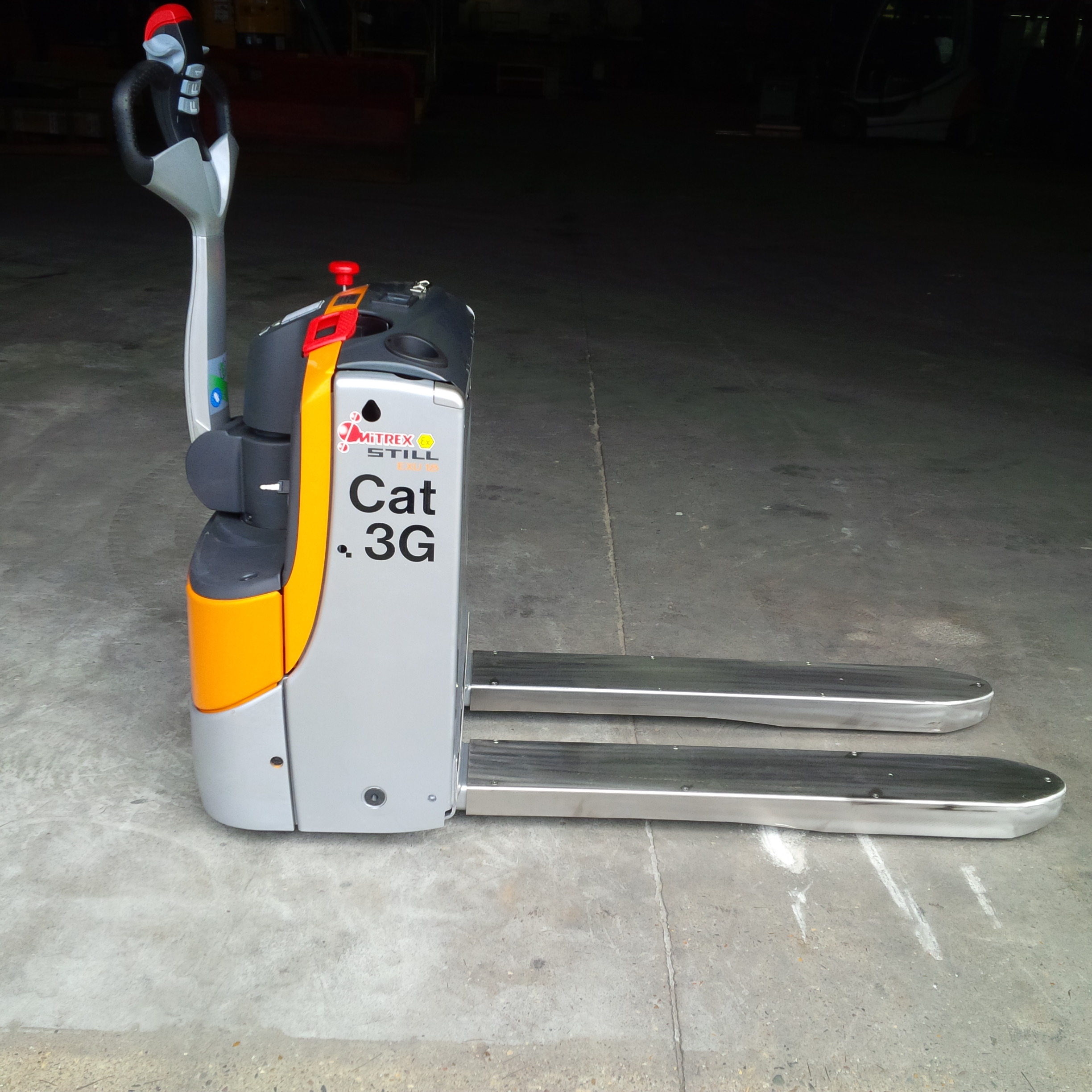 Wij verzorgen ook EX-trucks. Deze nieuwe STILL EXU-18 pallettruck is omgebouwd naar een Cat. 3G met Zone 2 explosiebeveiligingssysteem volgens ATEX richtlijn. Een systeem zonder gasdetectie, INOX vorkenbekleding en gecertificeerde cellen. Mooi spul!