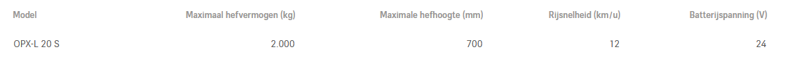 De OPX-L 20 S combineert kracht met ergonomie. Dankzij het scharend hefmechanisme stelt u eenvoudig de ideale werkhoogte tot 785 mm in. Met 2.390 mm vorklengte transporteert de truck twee pallets of lange goederen tot 2.000 kg moeiteloos. De grote batterijcapaciteit zorgt voor langdurige inzetbaarheid.