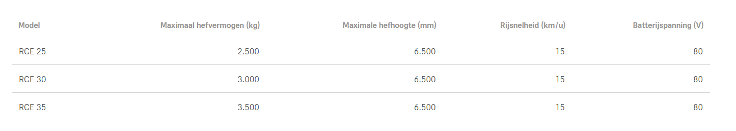 De robuuste constructie en onderhoudsarme AC-motor garanderen een lange levensduur met lage operationele kosten. De RCE levert constante prestaties, ook bij zware lasten en licht tot middelzware inzet.