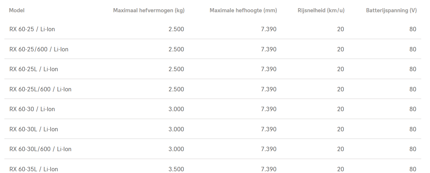 De zijdelingse batterijwissel is eenvoudig en snel, wat zorgt voor maximale inzetbaarheid. De RX-serie levert de hoogste handlingprestaties in zijn klasse, met een sprintmodus voor extra prestaties wanneer dat nodig is. Tevens leverbaar in een High-Performance variant met krachtige rij- en hefmotoren voor nog snellere acceleratie en hijsbewegingen.