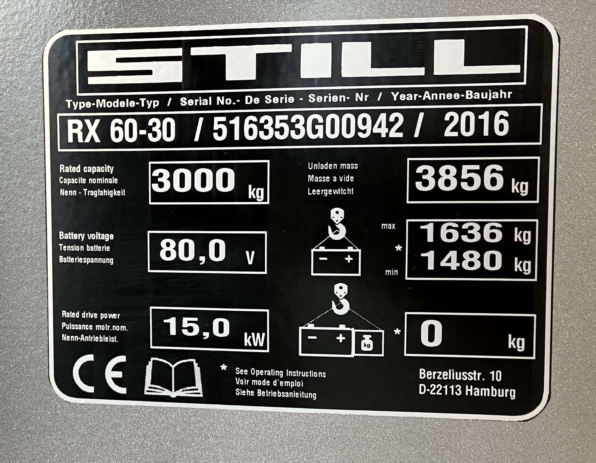 Jong gebruikte STILL RX 60-30 - triplo mast - fingertip bediening - geintegreerde sideshift - 4.590 mm hefhoogte - safety light - schijnwerpers voor.