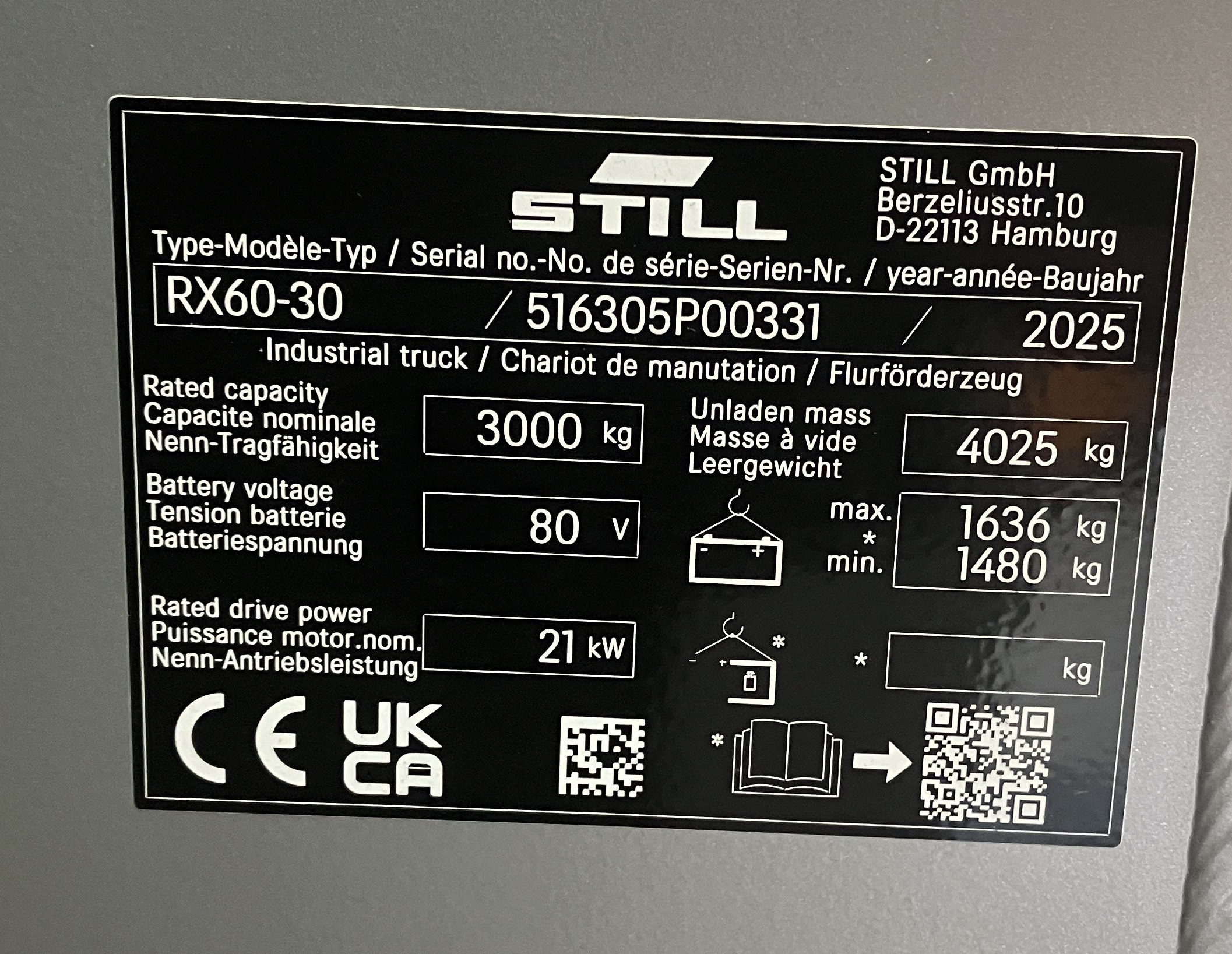 Nieuwe STILL RX 60-30 Plus(High Performance= extra sterke hefmotor en rijmotoren)/ triplo mast/ 4 functies/ voorruit/ dakruit/ MSG 75 stoel/ zonelichten/ Durwen RZV 35 S/ Fronius lader