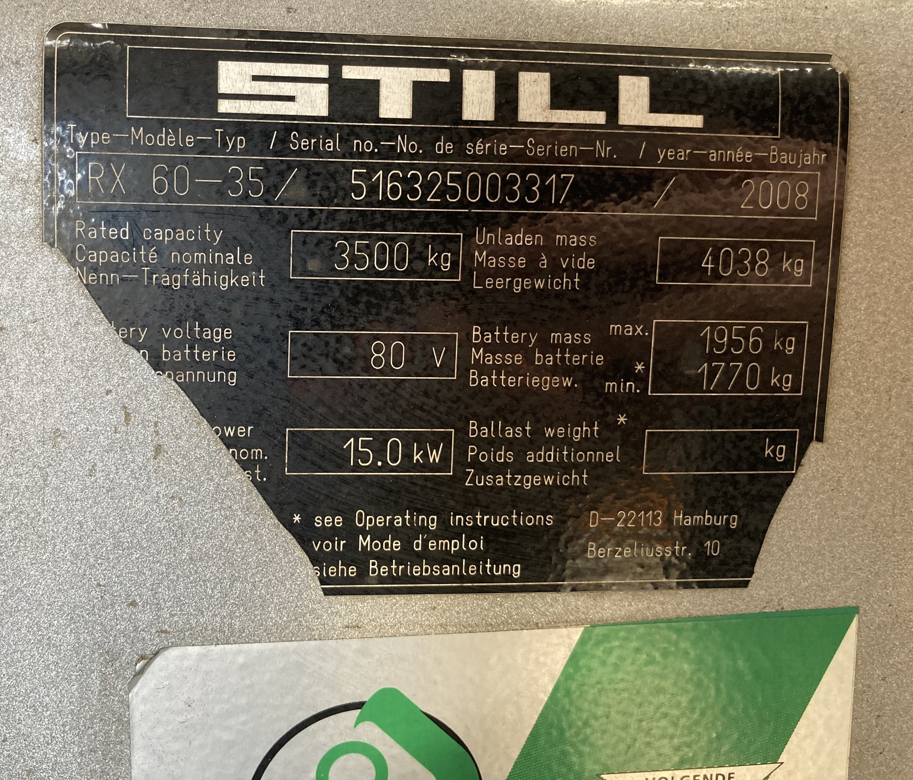 STILL RX 60-35 met agrarische specificaties, mooie truck met batterij van 2015.