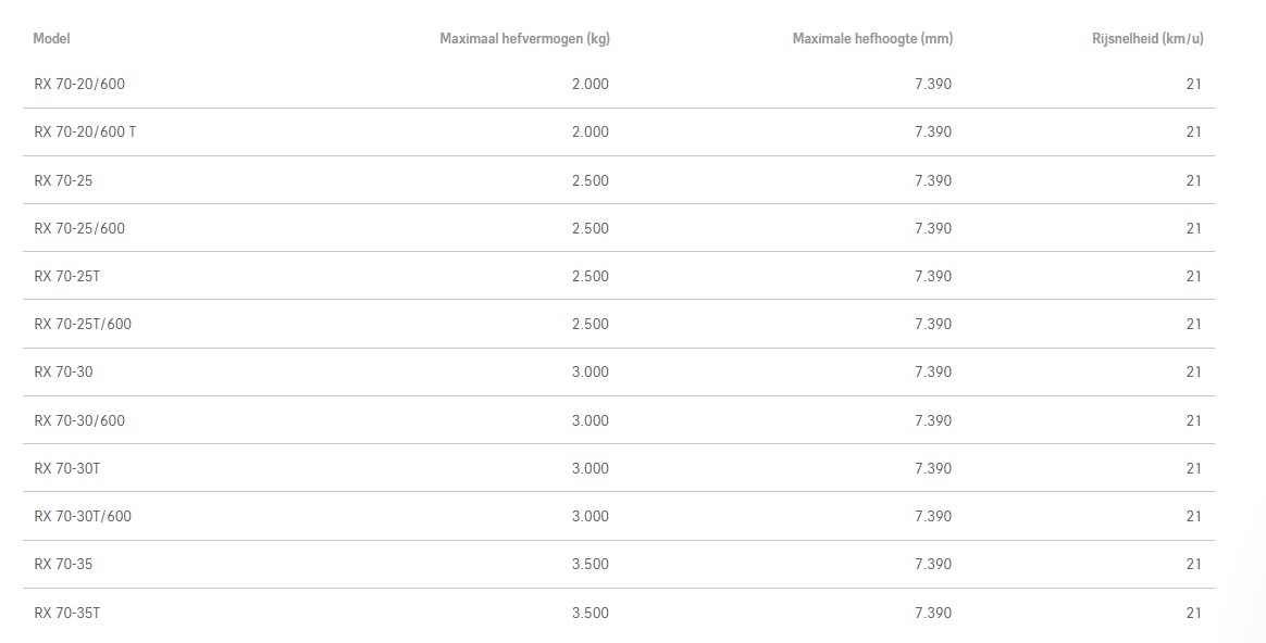 Met hun sterke constructie, beschermde componenten en onderhoudsarme technologie zijn de RX 70-trucks gebouwd om jarenlange betrouwbaarheid te garanderen, zelfs onder zware omstandigheden.