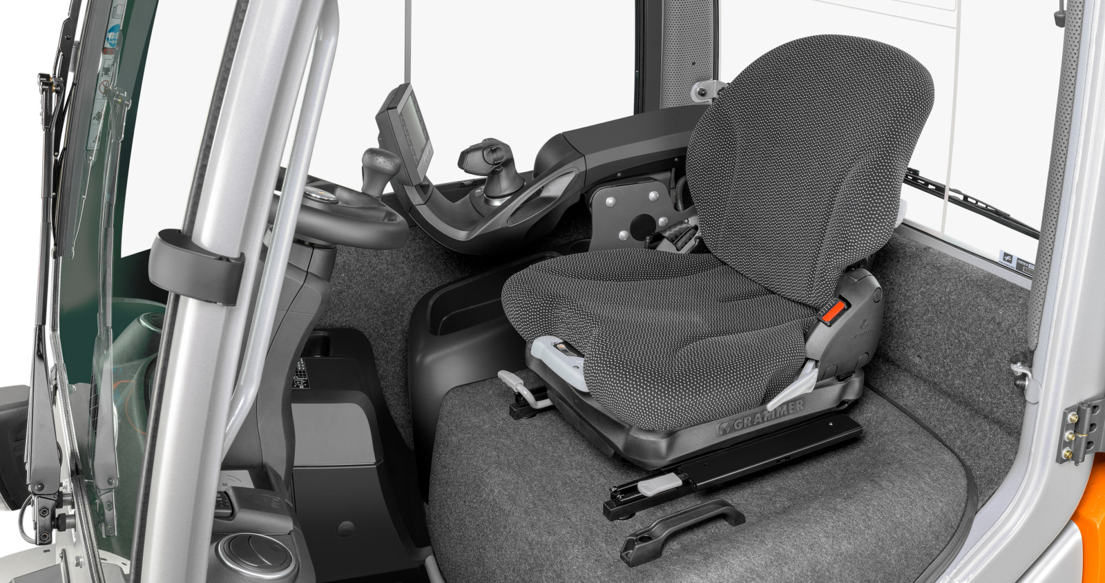 De ruime, ergonomische cabine met verstelbare stoel, duidelijke bediening en optimaal zicht rondom zorgt voor ontspannen en geconcentreerd werken. Instelbare rijprogramma’s ondersteunen elke taak; van maximale kracht tot energiezuinig manoeuvreren.